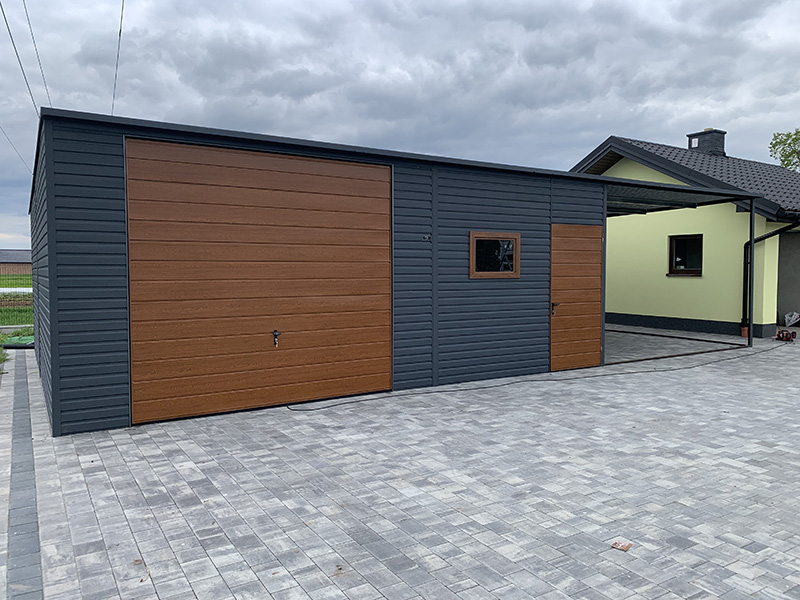 Nie musisz się martwić też o wentylację wewnątrz garażu – okno uchylne 80×60 w kolorze złoty dąb zapewni odpowiedni przepływ powietrza, a filc antykondensacyjny skutecznie zabezpieczy Twój pojazd przed wilgocią. Kolorystyka ścian w matowym odcieniu 7016 oraz przetłoczenia poziome dodają elegancji i nowoczesności całej konstrukcji. Kolorystyka ścian wykonana jest w kolorze 7016 mat, przedstawiając przetłoczenia poziome.